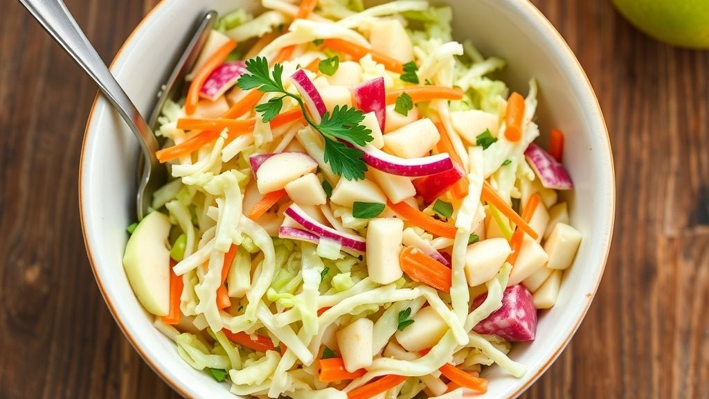 This creamy apple coleslaw recipe combines crunchy cabbage with sweet apples for a refreshing side dish. The tangy dressing adds a delightful flavor that pairs well with grilled meats and sandwiches.