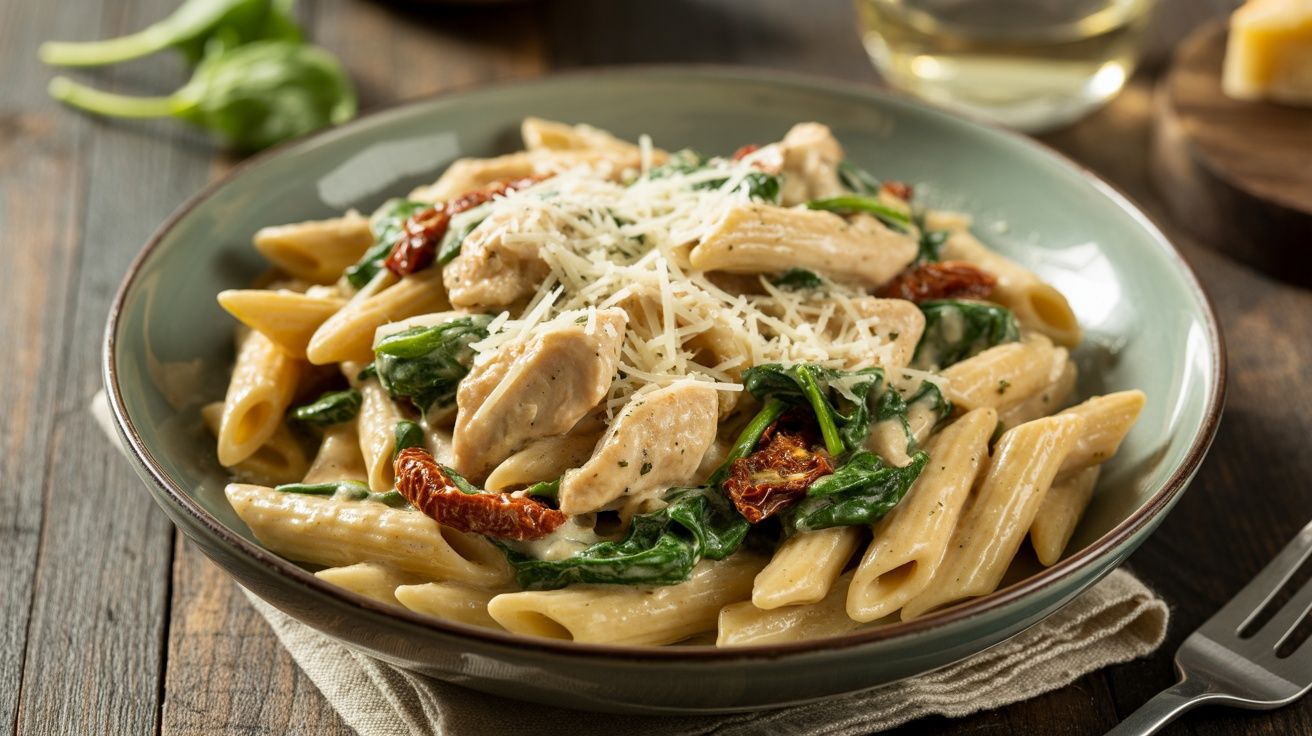 This dish features diced chicken breasts sautéed in olive oil, combined with garlic, shallots, and sun-dried tomatoes, then simmered with pasta and a creamy sauce. The addition of wilted spinach adds freshness, making it a complete meal. The recipe serves 4 and takes about 30 minutes from start to finish.